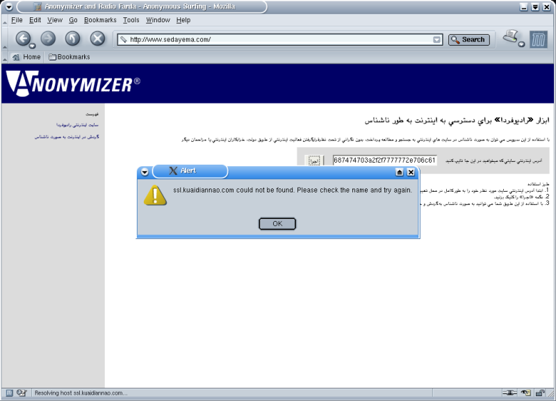 After setting some preferences via a cookie, the request is then redirected once again.POST http://sedayema.com/jump.cgi HTTP/1.1 url=687474703a2f2f7777772e726164696f66617264612e636f6d2f&k=&manual=yes&onclick%3D%27xorValue%28document.menu.url.value%2Cdocument.menu.k.value%29%27=%D8%A7%D8%AC%D8%B1%D8%A7 Location: http://anon.barandaz.com/cgi-bin/redirect.cgi?url=687474703a2f2f7777772e726164696f66617264612e636f6d2f