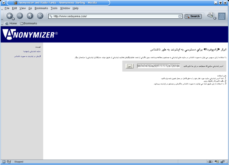 With this service you can surf, search and read the Internet anonymously, without the fear of being traced by the government, hackers or other intruders. [Translated from the text at http://www.sedayema.com]